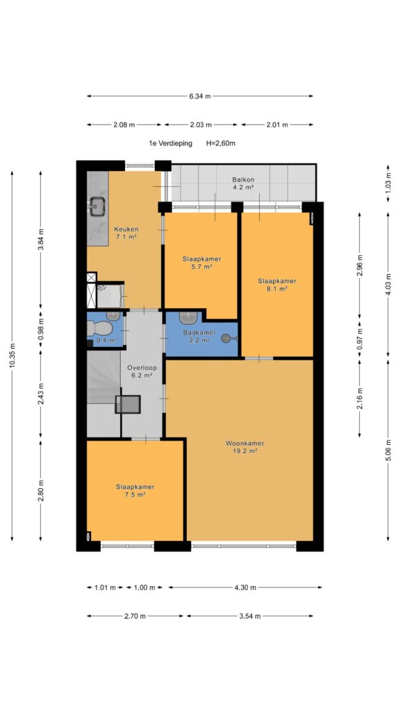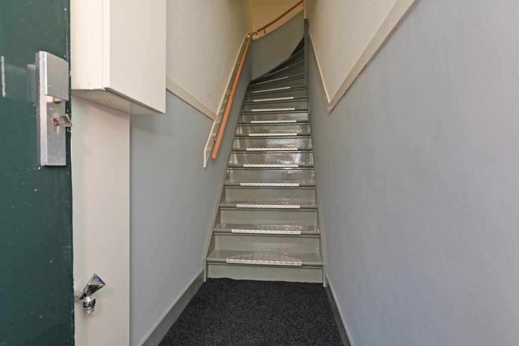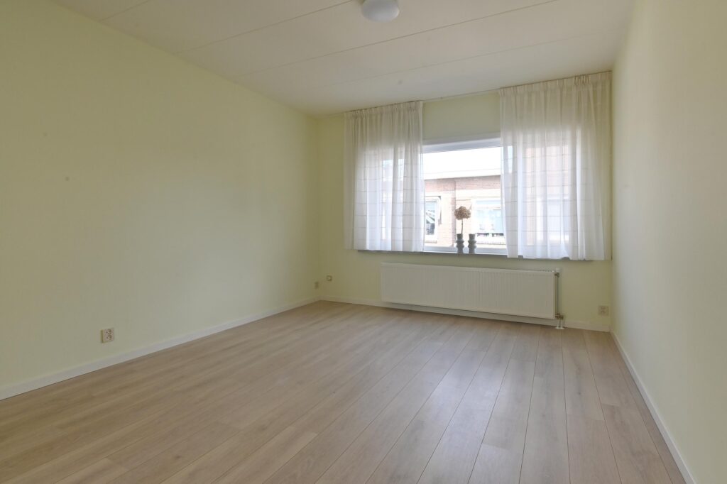 Entree op de begane grond, meterkast, inpandige trap naar de 1e etage, overloop, toiletruimte, badkamer met douche en wastafel, voorzijslaapkamer, woonkamer, slaapkamer achterzijde met toegang tot het balkon, nette keuken zonder inbouwapparatuur, vaste kast met de cv-ketel, vanuit de keuken toegang tot het balkon, 3e slaapkamer aan de achterzijde.