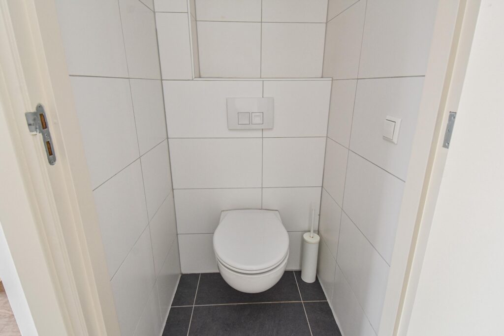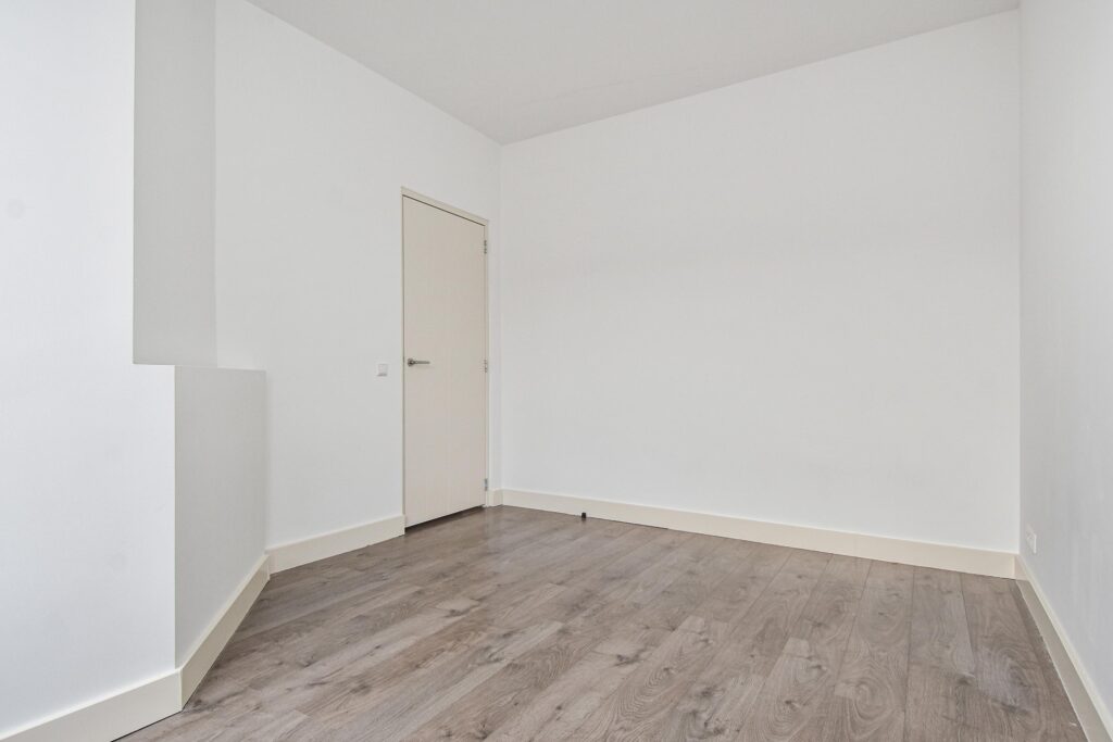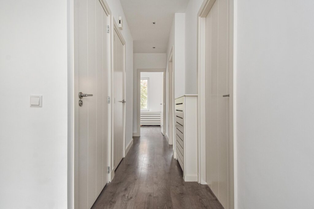 Entree via een open portiek, trap naar de 1e etage, entree woning, gang met een laminaatvloer doorlopend in het appartement, vaste kast met de meterkast, toilet, moderne badkamer met een inloopdouche, een vaste wastafel met meubel en de aansluiting voor de wasmachine, slaapkamer aan de voorzijde, woonkamer aan de voorzijde, ruime slaapkamer achter, keuken met een moderne inrichting voorzien van diverse apparatuur waaronder een 4-pits kookplaat, een afzuigkap, een magnetron, een vaatwasser en een koel-/ vriescombinatie, opstelplaats van de cv-combiketel, deur naar het balkon, 2e slaapkamer aan de achterzijde