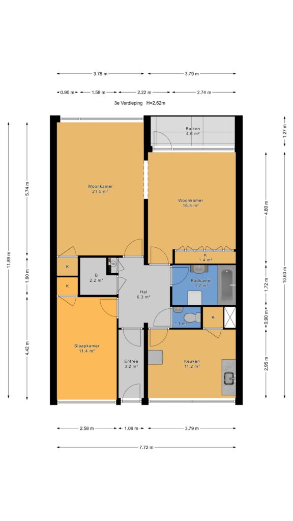 Entree via een gesloten portiek, lift naar de 3e etage, via de galerij entree van het appartement, vestibule, ruime hal, vaste kast, meterkast, toilet met fonteintje, eenvoudige badkamer met een ligbad, een vaste wastafel en de aansluiting voor de wasmachine, woonkamer met uitzicht op het plein, doorloop naar een ruime eetkamer c.q. 2e slaapkamer met deur naar het balkon, slaapkamer aan galerijzijde met een vaste kast, ruime keuken met een eenvoudige inrichting en een grote vaste kast.