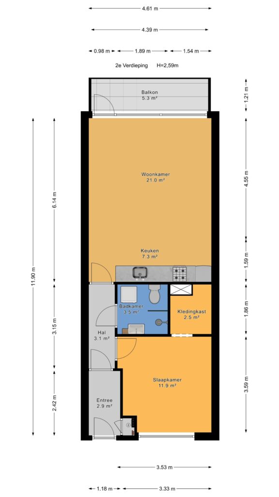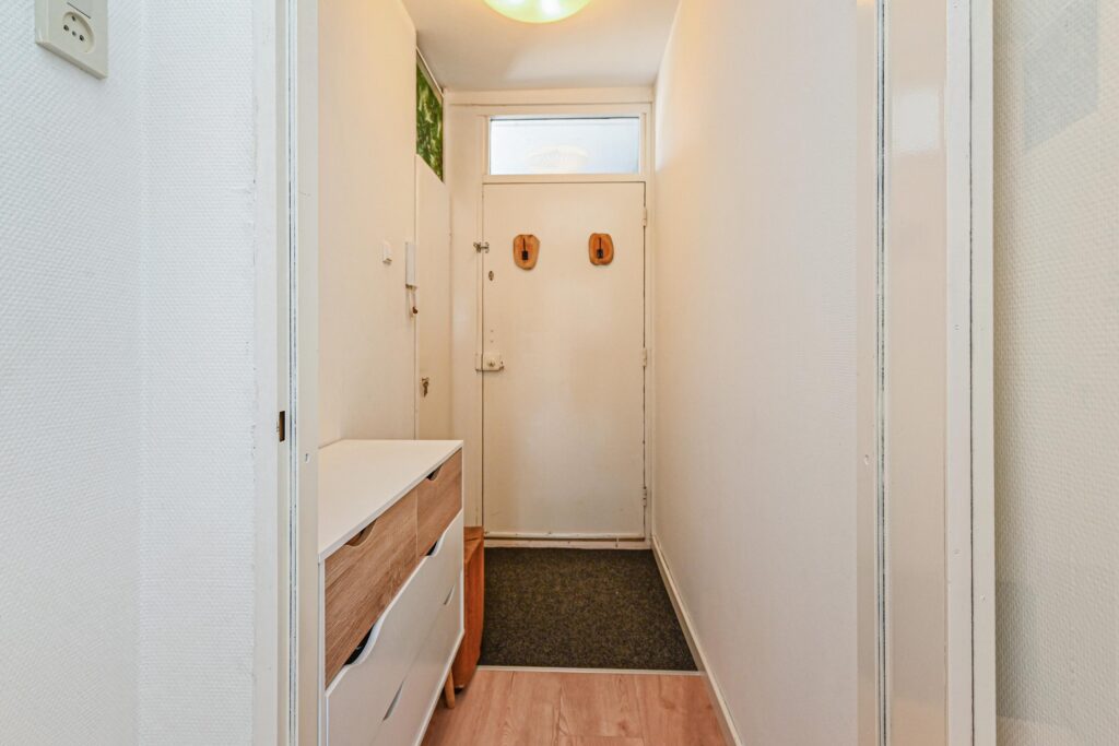 Entree via een gesloten portiek, trap naar de 2e etage, entree appartement, vestibule, meterkast, gang, slaapkamer aan de galerijkant met inloopkast, badkamer met een eenvoudige doch verzorgde inrichting voorzien van douche, toilet, wastafel en de aansluiting voor de wasmachine, woon-/ eetkamer aan de voorzijde met toegang tot het balkon op het zuiden, open keuken met een verzorgde inrichting voorzien van diverse apparatuur.