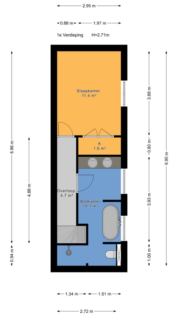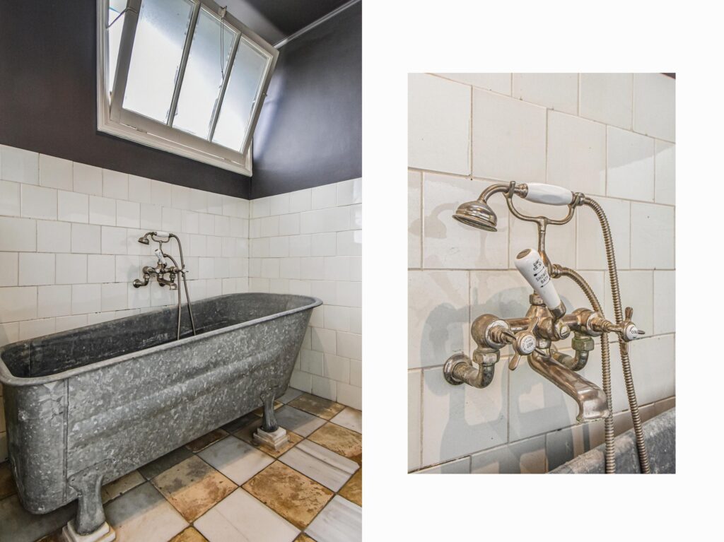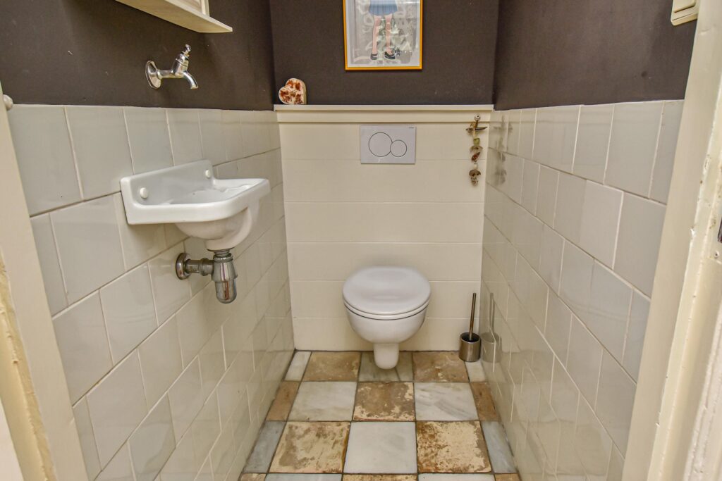 Eerste etage, overloop/gang, badkamer met zinken badkuip, inloopdouche, toilet en dubbele wastafel in meubel, tweede slaapkamer met twee vaste kasten.